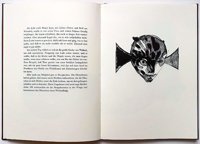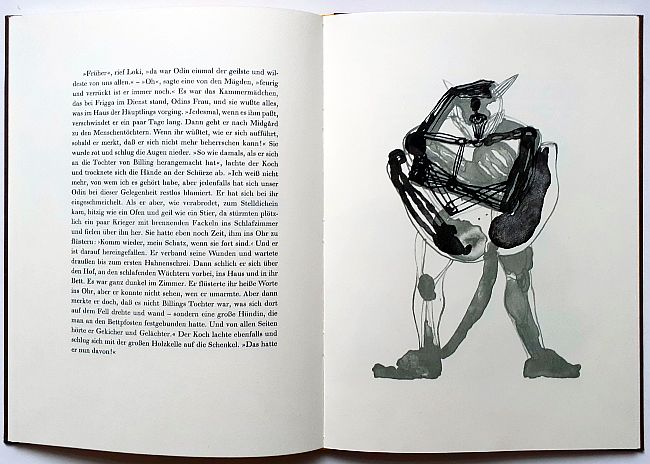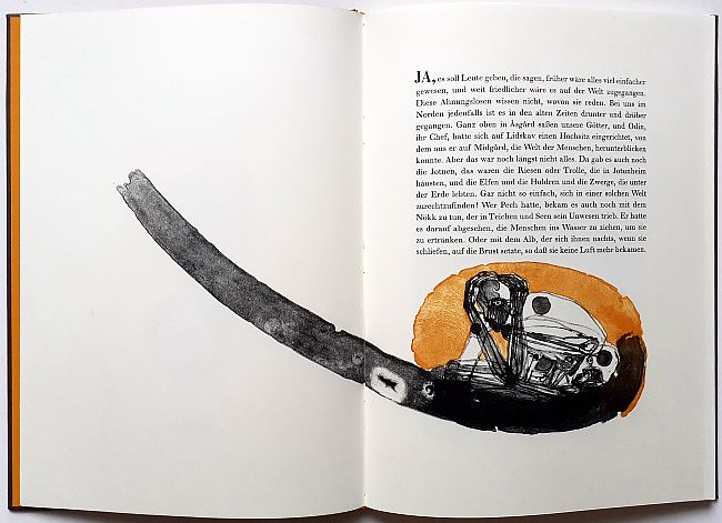 2001 erschienener 24. Druck der burgart presse, der den Leser in die von Enzensberger und seiner Tochter nacherzählte nordische Sagen- und Märchenwelt mit Göttern, Riesen und Trollen entführt. Illustriert mit 29 teils farbigen Originallithografien von Steffen Volmer. 44 Seiten, Hardcover, Halbpergament mit braunem Deckelbezug und gelb geprägtem Titel, Schuber. Format 30,5 x 22 cm, Druck in der Offizin Haag-Drugulin, Leipzig, den Steindruck besorgte Klaus Göbel, Chemnitz, den Handeinband Ludwig Vater, Jena. Eins von 30 römisch nummerierten Künstler- und Belegexemplaren. Im Druckvermerk von Enzensberger und Volmer signiert, verlagsfrisch