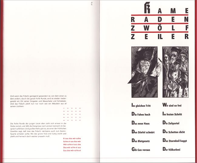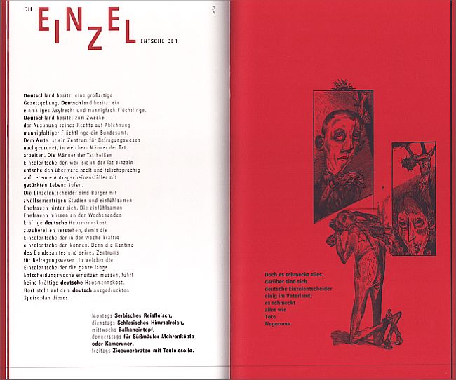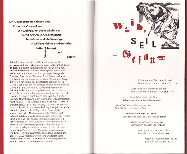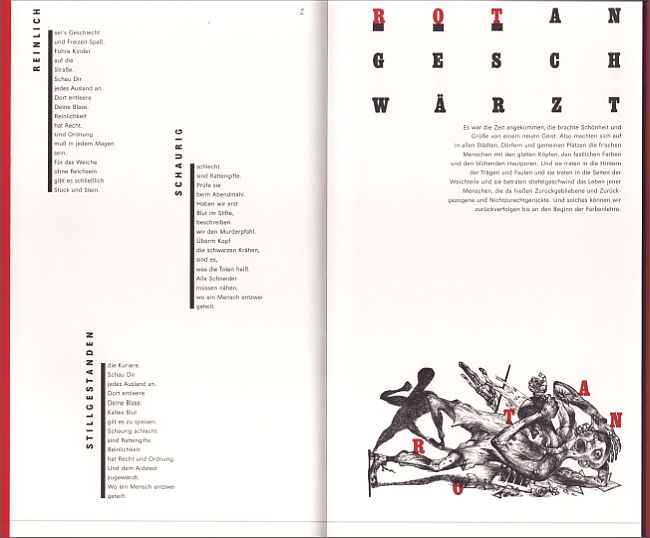 ...und andere verklärende Botschaften aus dem Reich des Bösen. 15. Druck der burgart presse, 1996. 47 Seiten, Broschur, Schutzumschlag, Format 29,5 x 17 cm, Blockbuchbindung, Auflage 150 Exemplare. Vom Matthias Biskupek, Karl-Georg Hirsch und dem Buchgestalter Gert Wunderlich im Impressum signiert. Verlagsfrisch
