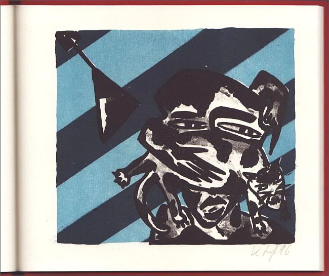 12 kurze Texte des Künstlers und 12 Orig.-Farblithografien, einzeln signiert, Texte im Handsatz und Buchdruck, Hardcover, Format 22,5 x 19 cm, Auflage 15 Exemplare. Auf dem vorderen Deckel bei diesem Exemplar eine farbige Handzeichnung des Künstlers. Im Impressum nummeriert und zusätzlich vom Künstler signiert