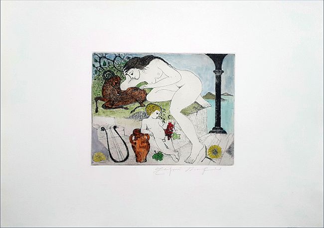 Unikat, signiert. Bildformat 18,5 x 23,5 cm, Papierformat 38,5 x 53,5 cm. Die Bezeichnung e.a. (épreuve d’artiste) bezieht sich auf die Auflage der Originalradierung in Schwarzweiß.