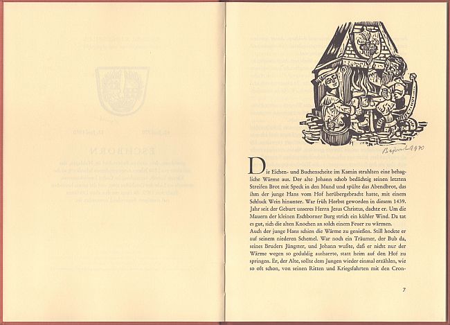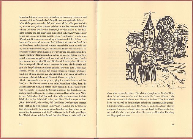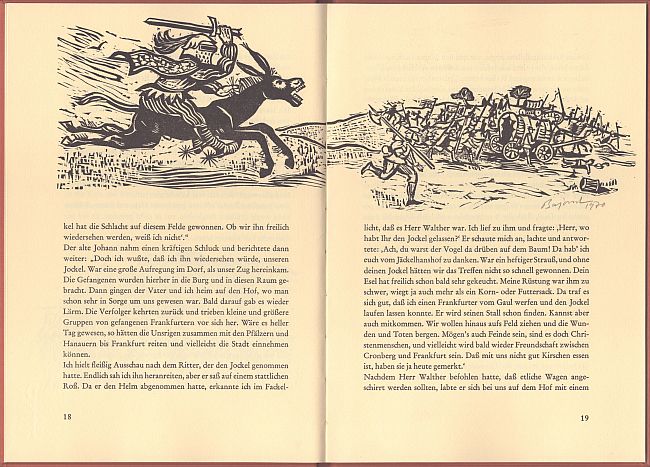 Eine alte Mär neu erzählt von Helmut Bode, mit 10 einzeln signierten Orig.-Holzschnitten von Archibald Bajorat. 32 Seiten, Hardcover, Format 26,5 x 18,3 cm, mit einem aufgedruckten weiteren signierten Holzschnitt von Bajorat