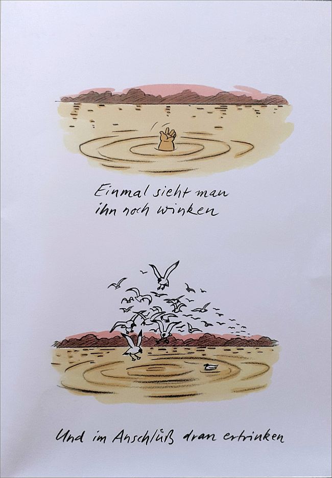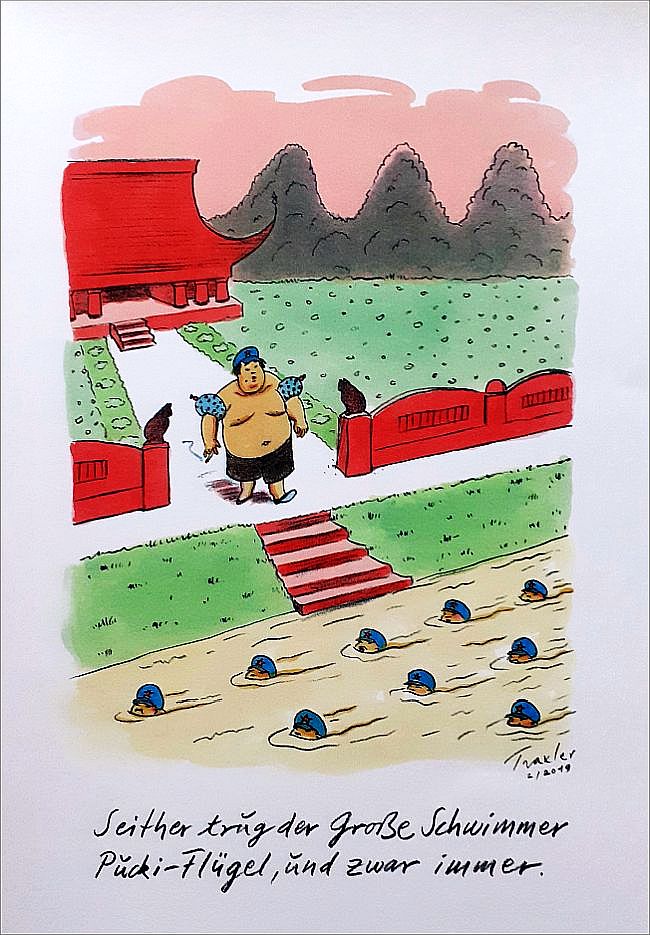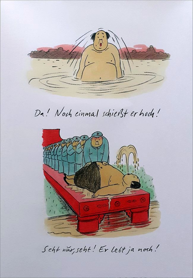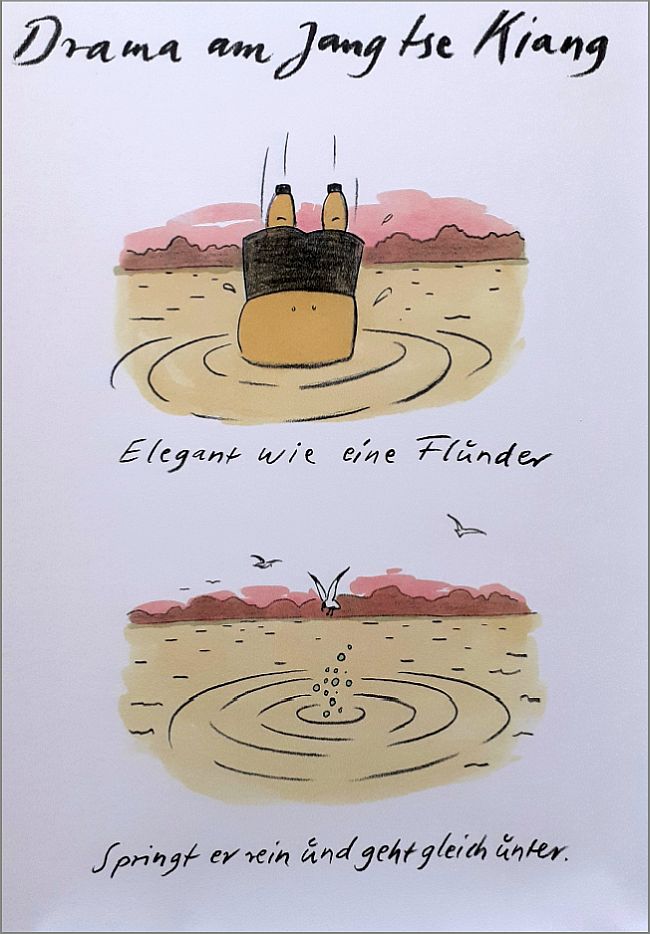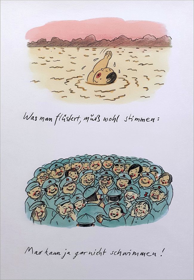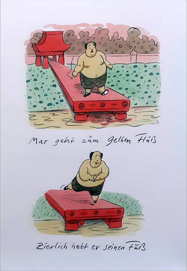 „In den Jahren 1956 und 1966 soll Mao Zedong den Jang tse Kiang durchschwommen haben. In Rekordzeit. Hans Traxler hat da seine Zweifel. Im ersten BÜCHERGILDE BILDERBOGEN erzählt er uns eine andere Version dieser Episode. Bei ihm geht Mao baden. Eine exklusive Bilderschichte mit Reim und Witz vom Meister der Neuen Frankfurter Schule.“