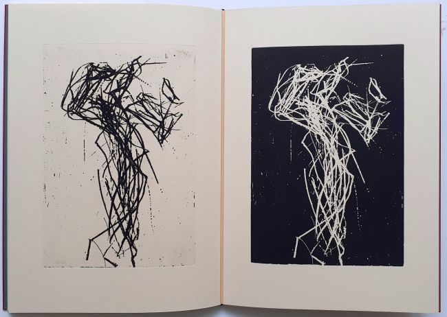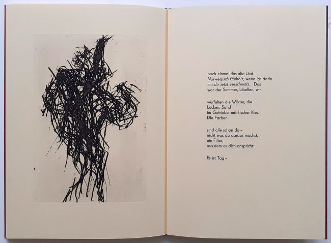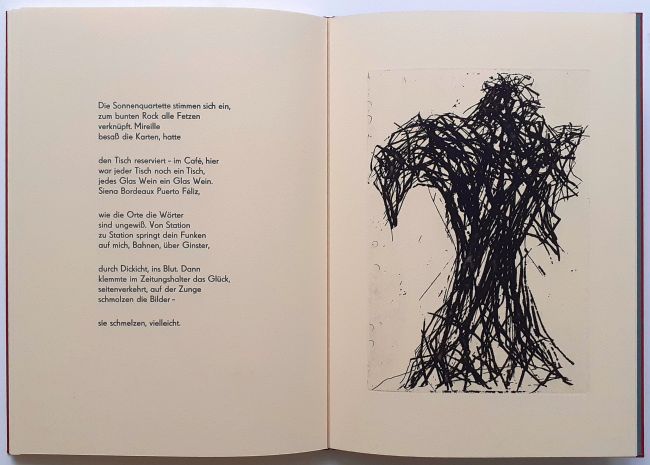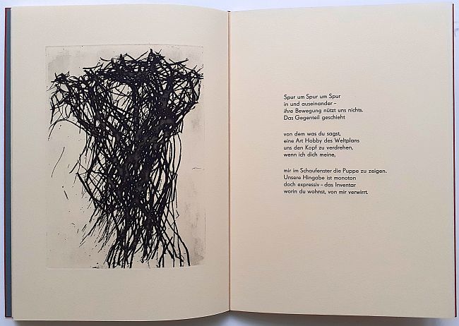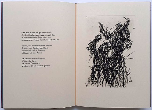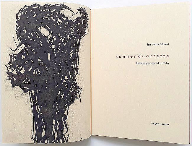 6 Gedichte von Volker Röhnert mit 7 ganzseitigen Radierungen in der Technik der Reservage von Max Uhlig, 20 Seiten, als Blockbuch gebunden, Format 40 x 29 cm, e.a. (épreuve d’artiste), Handsatz, Buchdruck, Handeinband. Im Impressum von Autor und Künstler signiert. Verlagsfrisch