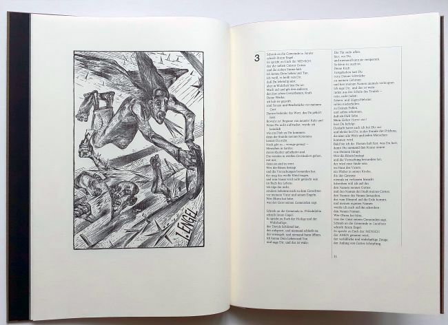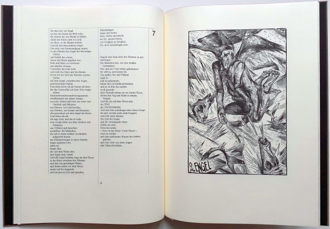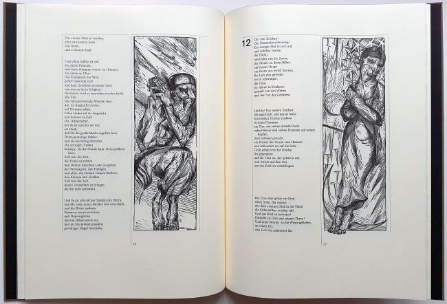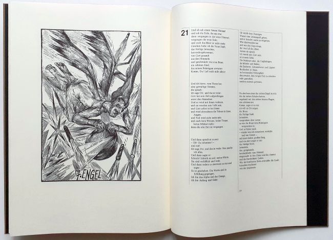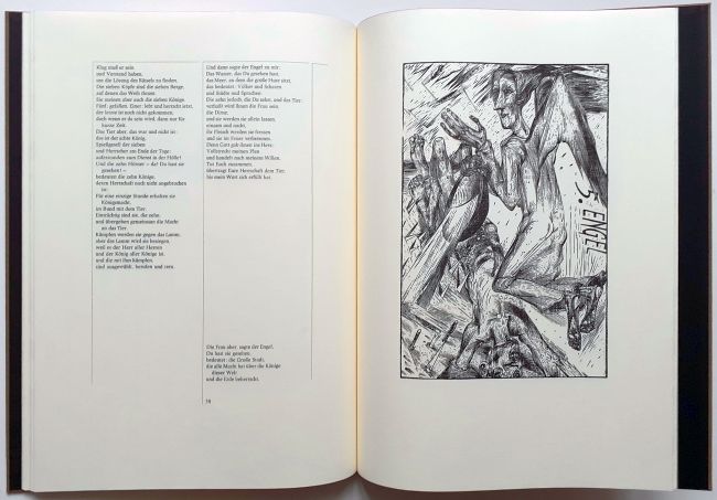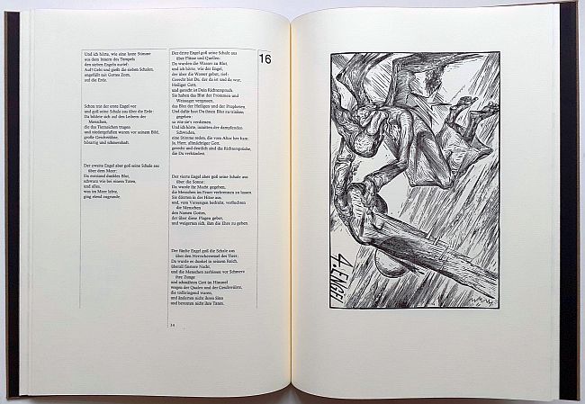 1. Druck der burgart presse, 1991. Die Offenbarung des Johannes. Hardcover, Format 39,5 x 29 cm, Halbpergament, 55 Seiten, als Blockbuch gebunden. Buchdruck, Druck der Holzschnitte von den Originaldruckstöcken durch Matthias Kleindienst. Eins von 30 Künstler- und Belegexemplaren, im Impressum von Karl-Georg Hirsch und Walter Jens signiert. Unauffällige Längsfalten im Vor- und Nachsatzblatt. Verlagsfrisch