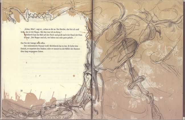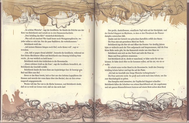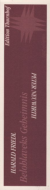 Eine Erzählung von Harald Friedl, mit der der Autor den ersten Platz beim 2. Literaturpreis der Int .BuchKunstBiennale 2000 Horn erlangte. Durchgehend mit „rahmenden“ Orig.-Flachdruckgrafiken (im Druckvermerk als „Offsetfarblithografien“ bezeichnet) von Peter Neuwirth ausgestattet. Broschur mit originalgrafischem Schutzumschlag und originalgrafischem Lesezeichen, Fadenheftung, Format 22 x 17 cm, 40 Seiten, Auflage 400 Exemplare, im Impressum von Friedl und Neuwirth signiert und nummeriert