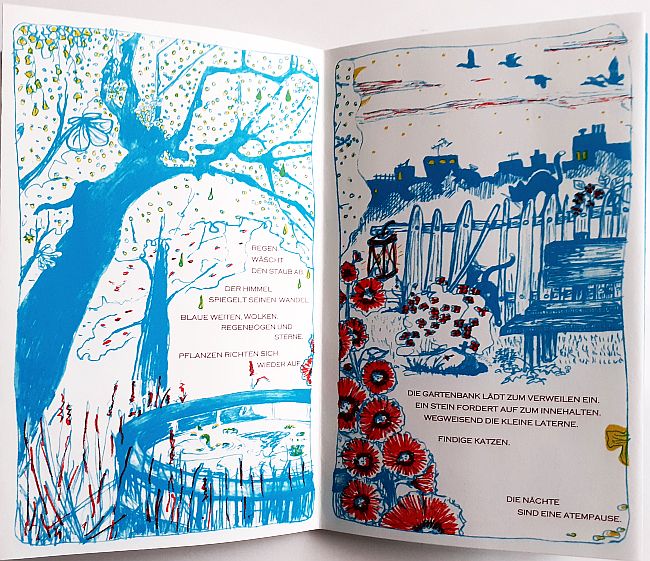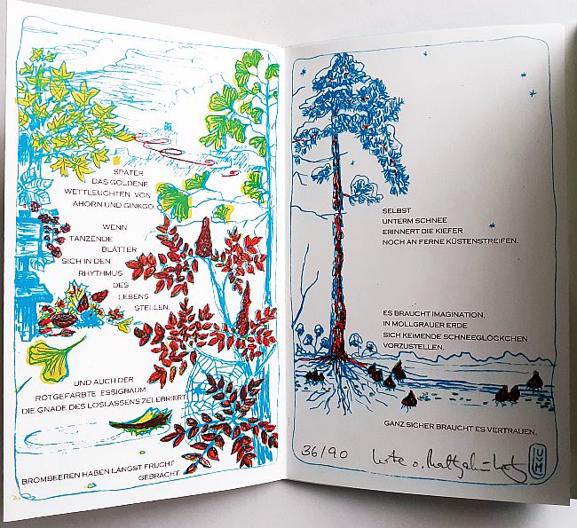 mit Texten von Urte von Maltzahn-Lietz. 8-seitiges Leporello,Umschlag, mit 3 Sonderfarben im Handoffset gedruckt, Handsatz, handgebunden. Format 20 x 13 m, Auflage 90 Exemplare, signiert und nummeriert