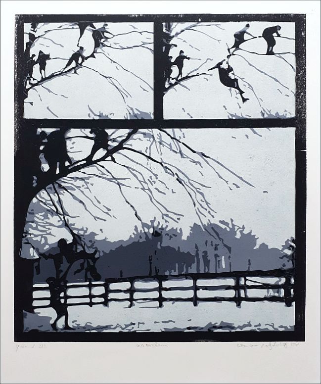 In der Technik der verlorenen Form. Bildformat 47,5 x 42 cm, Papierformat 55,5 x 46 cm, hier ein mit „Zustandsdruck“ bezeichnetes und als 3. Blatt von 3 Drucken in dieser Farbvariante nummeriertes Exemplar. Signiert