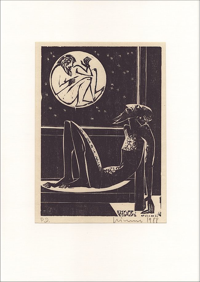 zum Gedichtband „Die Zaubertrommel“ von Erich Fitzbauer aka Hieronymus Zyx. Fest montiert in aufklappbarem Passepartout; Format 27 x 20 cm, Auflage 200 Exemplare, hier ein mit P.D. bezeichneter, vom Künstler selbst gedruckter Probedruck, signiert