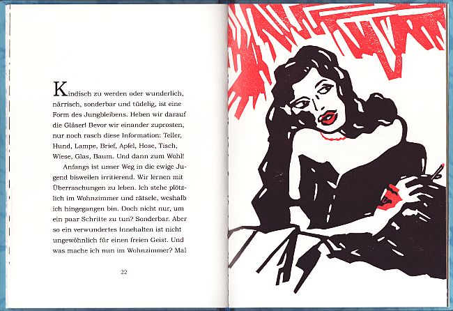 In wunderbare Buchform gegossene „Altersweisheiten eines Elder Statesman“ (Untertitel). Mit 9 teils farbigen ganzseitigen Orig.-Linolschnitten von Svato Zapletal, die der Künstler selbst in der Andruckpresse gedruckt hat. Hardcover, Format 21 x 15,5 cm, hellblaues Ganzleinen, mit roter Titelprägung und originalgrafischer Bauchbinde. Pappschuber mit roten Kanten. 33 Seiten, Gesamtauflage 90 Exemplare, im Impressum nummeriert und von Svato Zapletal signiert
