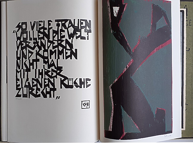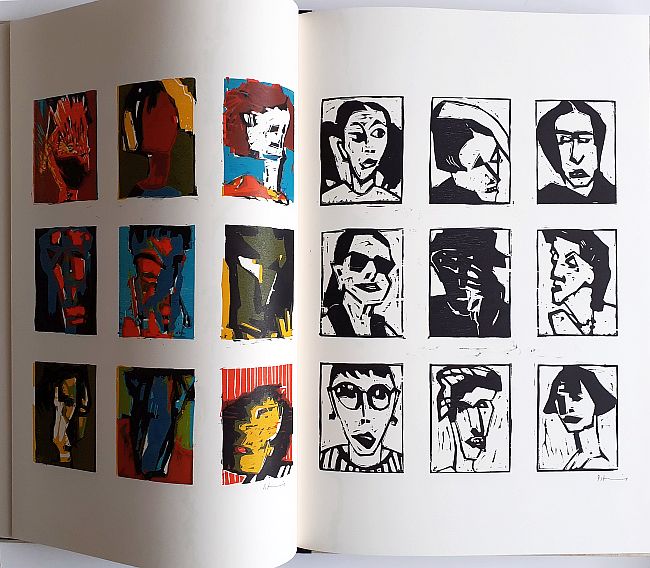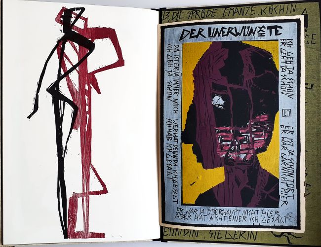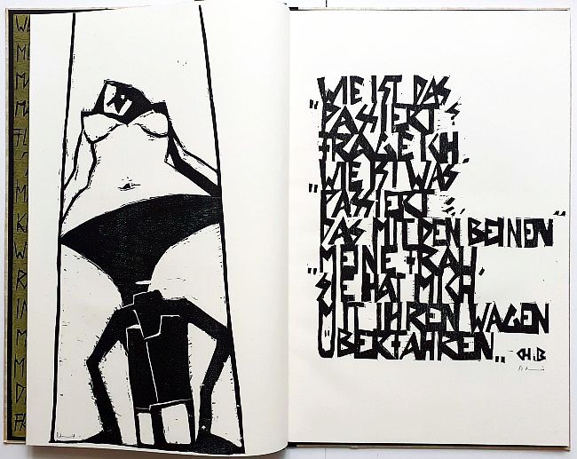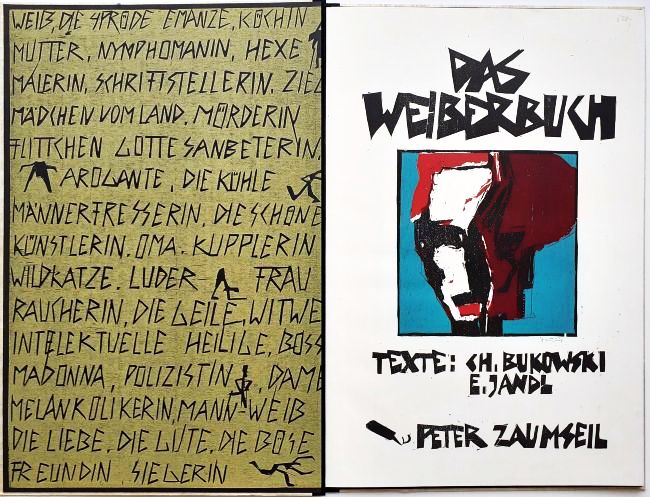 Mit einer lose beiliegenden Zeichnung (Bleistift, Tusche, Format 20 x 15 cm, signiert) und 19 von den Stöcken gedruckten und einzeln signierten Holzschnitten zu Texten von Charles Bukowski und Ernst Jandl. 16 Seiten, Format 61 x 40 cm + 1 fest eingebundenes Doppelblatt im Format 54 x 36,5 cm. Japanische Blockbuchbindung, Vor- und Nachsatz vom Stock gedruckt. Buchformat 63 x 44,5 cm, fester Einband mit Titelholzschnitt auf Papyrus. Auflage 90 Exemplare, im Impressum von Peter Zaumseil signiert und nummeriert. Leichte Beschädigung am unteren Buchrücken.