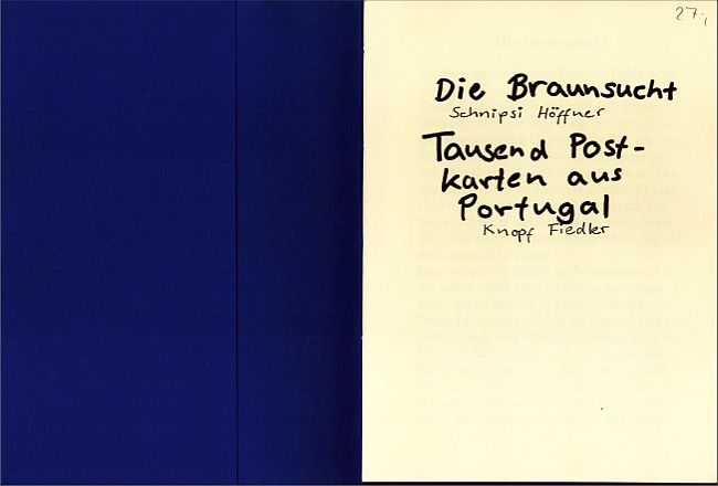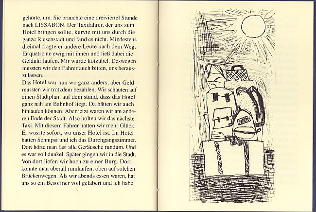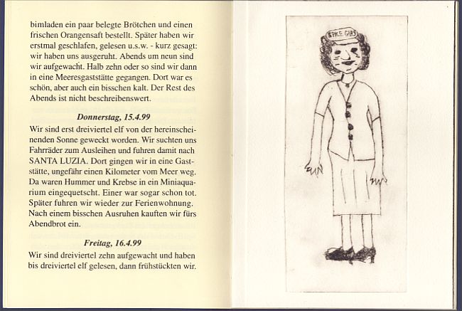 Erzählungen von Schnipsi Höffner und Knopf Fiedler. Mit 2 Zeichnungen und einer ganzseitigen sowie einer doppelseitigen Radierung. Broschur, Format 20,2 x 15 cm, japanische Blockbuchbindung, 20 nicht nummerierte Seiten, Auflage 15 Exemplare