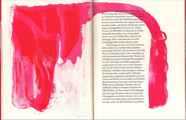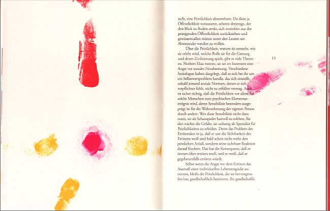 Wunderbare Essays über das Peinliche. Erstausgabe. 32 Seiten mit 15 farbigen, sehr malerischen Orig.-Flachdruckgrafiken von Hermann Kremsmayer, davon 3 doppelseitig, 2003. Broschur, Fadenheftung, Lesezeichen. 22 x 17 cm, Auflage 400 Exemplare, im Impressum von Autor und Grafiker signiert und nummeriert